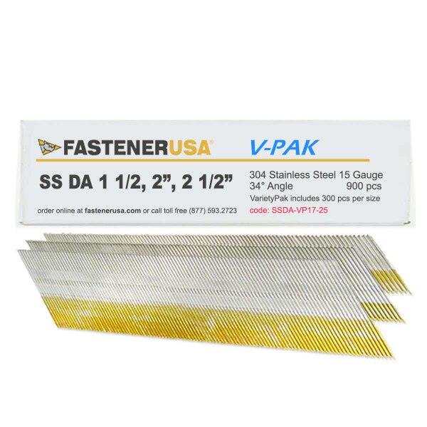 304 Stainless 1-1/2", 2", 2-1/2" DA ANGLE FINISH NAILS 15 GAUGE 900ct VarietyPak