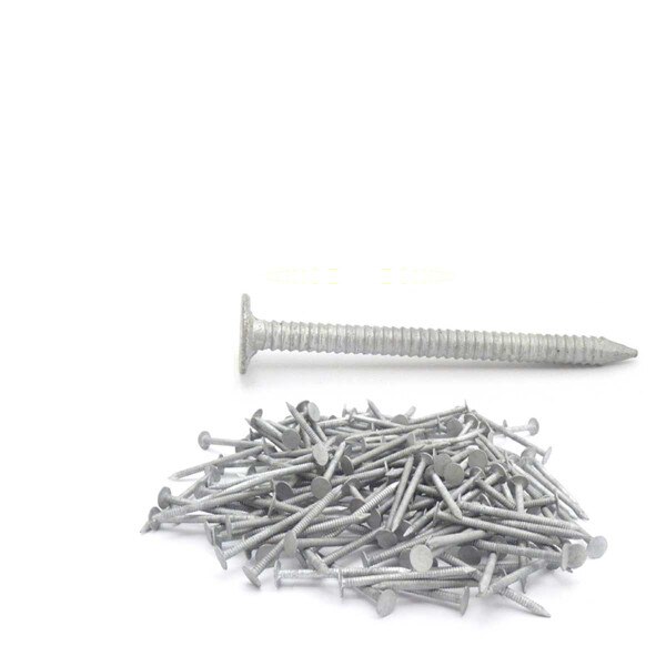 Our ASTM A153-D True Hot Dip Nails are HOT DIPPED. They meet and/or exceed the United States standard for Hot Dip Zinc Mass Coating of ASTM A153 class D Fasteners. These 1 3/4" nails are .120" (11 Gauge) RING SHANK with a large 3/8" diameter flat head and regular diamond point. Ring shank nails, also known as annular thread, offer superior holding power in wood and plywood roof decks. Roofing Nails are commonly used for Asphalt Shingles, Slate and Clay Tile. For slate roofs choose correct nail length by adding one inch to twice the thickness of slates. Each box contains 5 pounds. Approximately 160 nails per pound.