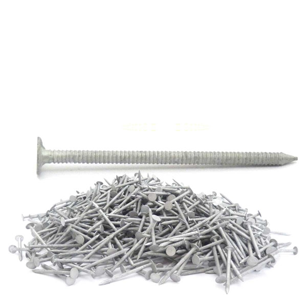 These 2 1/2" nails are .120" (11 Gauge) RING SHANK with a large 3/8" diameter flat head and regular diamond point. Ring shank nails, also known as annular thread, offer superior holding power in wood and plywood roof decks. Roofing Nails are commonly used for Asphalt Shingles, Slate and Clay Tile. For slate roofs choose correct nail length by adding one inch to twice the thickness of slates. Each box contains 25 pounds. Approximately 118 nails per pound.