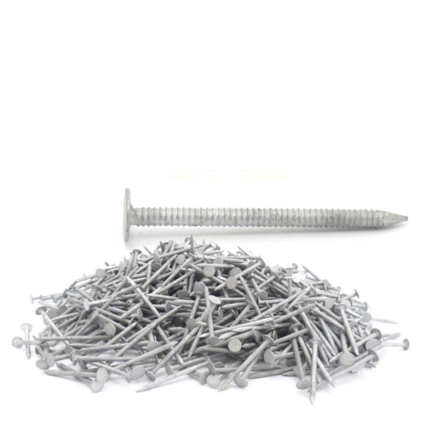 Our ASTM A153-D True Hot Dip Nails are HOT DIPPED. They meet and/or exceed the United States standard for Hot Dip Zinc Mass Coating of ASTM A153 class D Fasteners. These 2" nails are .120" (11 Gauge) RING SHANK with a large 3/8" diameter flat head and regular diamond point. Ring shank nails, also known as annular thread, offer superior holding power in wood and plywood roof decks. Roofing Nails are commonly used for Asphalt Shingles, Slate and Clay Tile. For slate roofs choose correct nail length by adding one inch to twice the thickness of slates. Each box contains 25 pounds. Approximately 142 nails per pound.